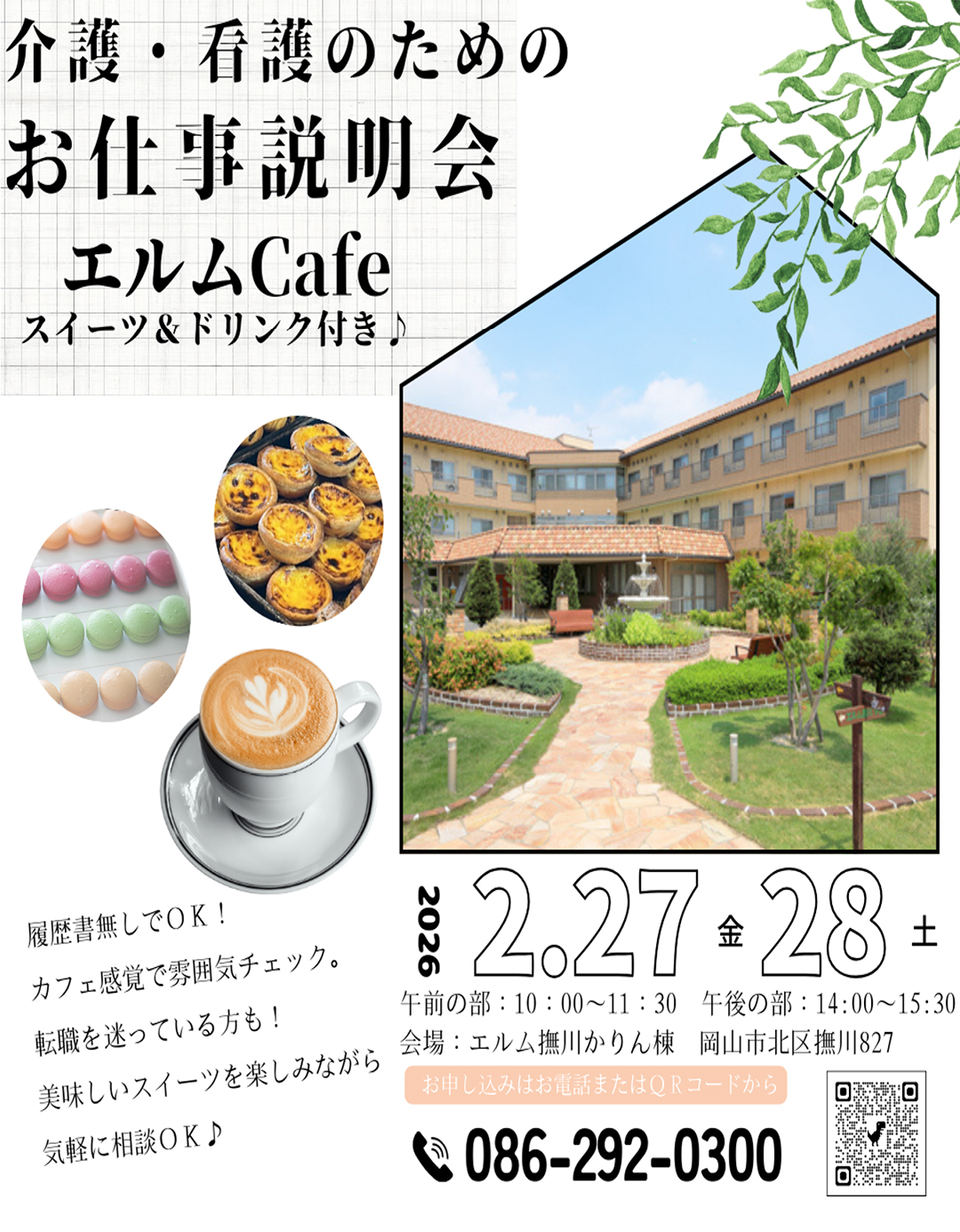 | 対象 | エルム撫川や介護職に興味がある方 ※未経験者、ブランクのある方も大歓迎! ※服装自由、履歴書不要 |